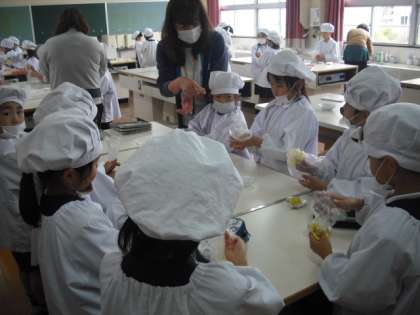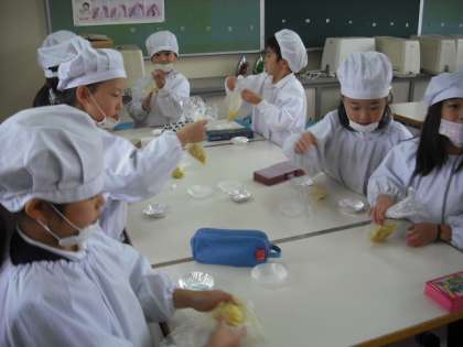 2年生が、家庭科室で、スイートポテト作りにチャレンジしています。