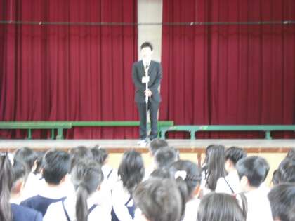 玉出小学校の卒業生で、教員を目指している末永さんが、スクールサポーターとして毎週月曜日に来てくれることになりました。秋には教育実習もあります。ずいぶんと変わった校舎に驚いていました。