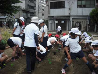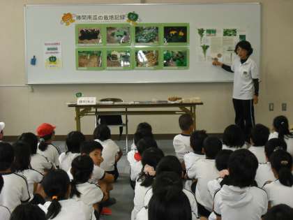 辰巳さんをゲストティーチャーに迎え、こつまなんきんを植えました。これから、成長して収穫するのが楽しみです。多目的室でもお話を聞きました。大阪の伝統野菜がこの玉出の地にあることを誇りに思いました。