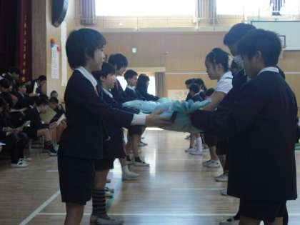 6年生から「手作り雑巾」と合奏「HANABI」のお礼がありました。
