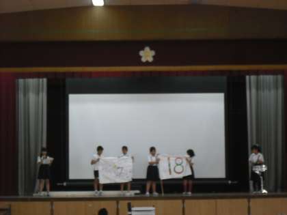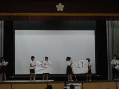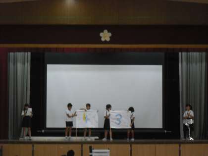 土曜授業で行われたドッジボール大会の結果が発表されました。第1位は3・4班9勝3敗(勝ち点33)、第2位は17・18班8勝3敗1引き分け(勝ち点29)、第3位は1・2班8勝4敗(勝ち点28)でした。お子様は何位だったか聞いてみてください。児童会が舞台で旗を広げるたびにドキドキしました。