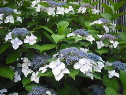 校庭裏、ごみステーション横のアジサイが小雨の中で美しく咲いています。