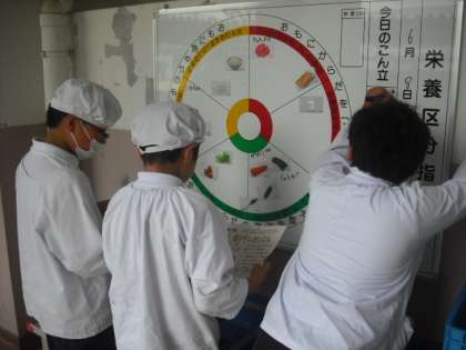 給食室前では、健康委員会の担当児童が『栄養区分指導表』の掲示物を作成しています。