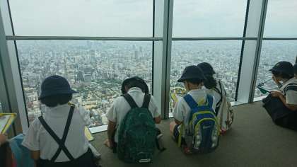3年生が、あべのハルカスに社会見学に行きました。地上300メートルの展望台から見る大阪の町の様子を調べます。東西南北の特徴を記録します。
