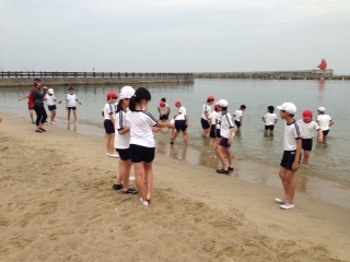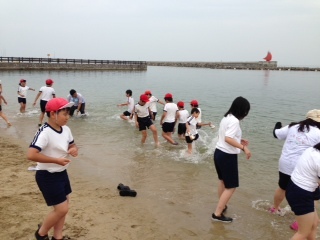 おそるおそる、足をつけていました。けれども、そこは子どもたちです。だんだんと大胆になりました。びしょびしょになる子どもがいるかも知れないけど、めいっぱい楽しんでいます。