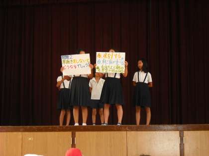 給食委員会・健康委員会による劇でした。早寝・早起き・朝ごはんの効果がよくわかるストーリーでした。クイズもあっておもしろかったです。子ども達の心に届いて、守っていけたらいいですね。