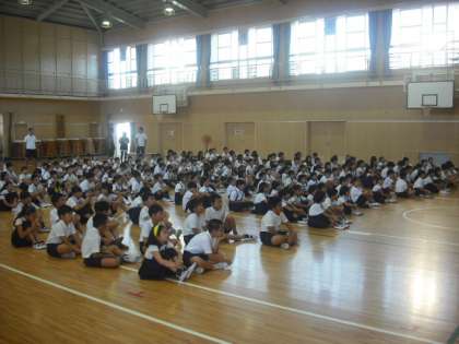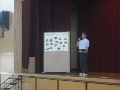 次に、土・日にあったサマーキャンプ(青少年指導員主催)の話がありました。テントを張ったり虫取りをしたりと、自然体験の楽しさが伝えられました。奈良のやすらぎ村で聞かれたミンミンゼミの鳴き声を聞かせてもらいました。