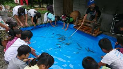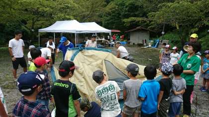 テントを張ったり、魚つかみや虫取りなど自然体験を楽しみます。