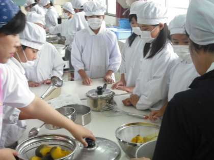 自分たちで収穫したこつま南瓜を調理して食べます。