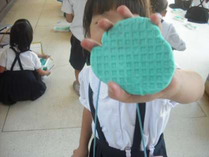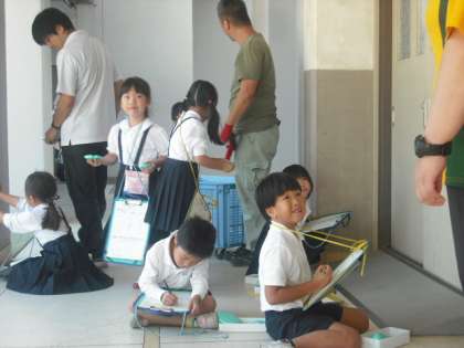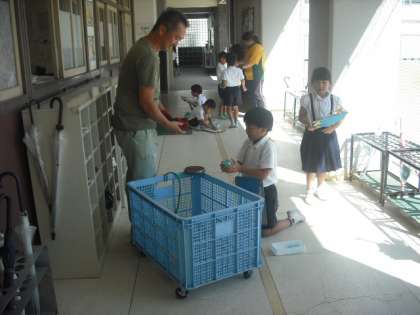 1年生が粘土を持って職員室周辺に集まって来ました。