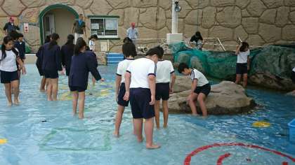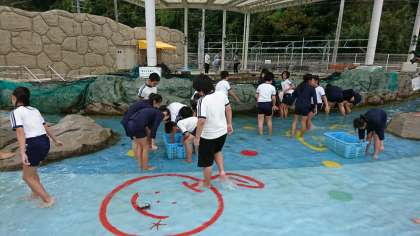 魚や伊勢エビやヒトデを手でつかみました。足湯を楽しむ6年生もいます。