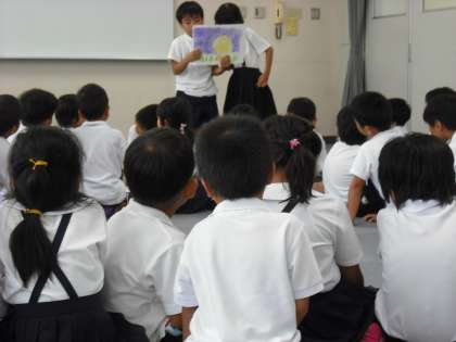 1年生に手作り紙芝居を読み聞かせしました。「黄色いバケツ」です。一生懸命に聞いてくれる1年生に2年生も熱がこもります。ほのぼのとした交流でした。