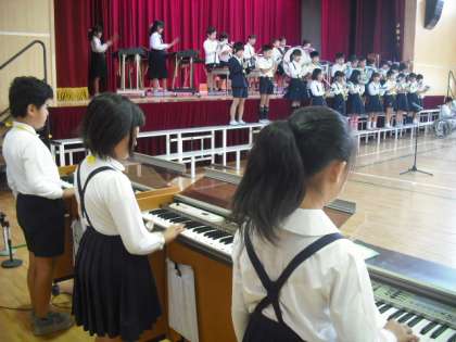 玉小コンサートに向けての講堂練習、今日は中学年の紹介です。