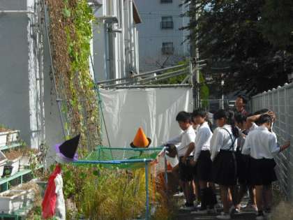 1組は、校舎裏の学級園でヘチマとヒョウタンの観察です。
