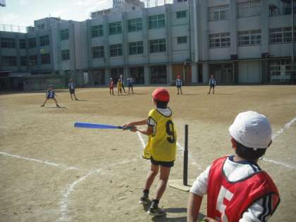 2組は、運動場でベースボール型ゲームです。