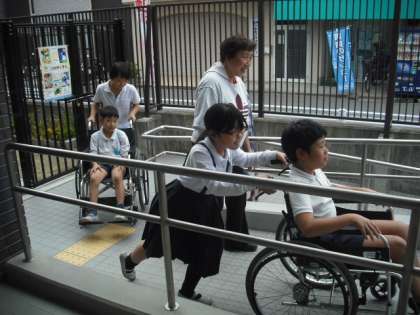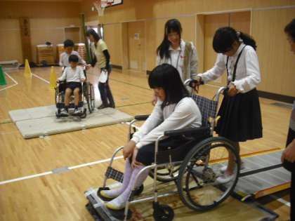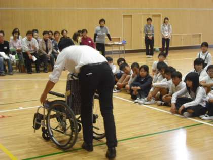 4年生が、「人に優しい町つくり」というテーマで車イス体験をしました。