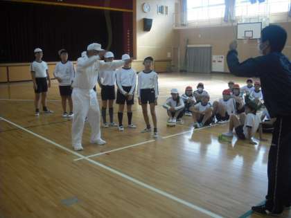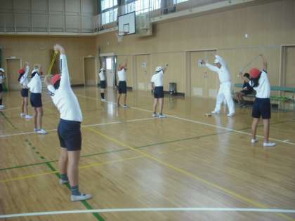 まず、真空跳び、二重跳びの短縄技でウォーミングアップし、長縄では、かぶり縄から、むかえ縄を練習しました。