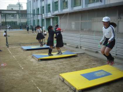 10月末に登場した縄跳びジャンプ台で、縄跳びの特訓中。みんなが飛ぶ真ん中の部分は、ペンキが取れて木肌が見えてきました。