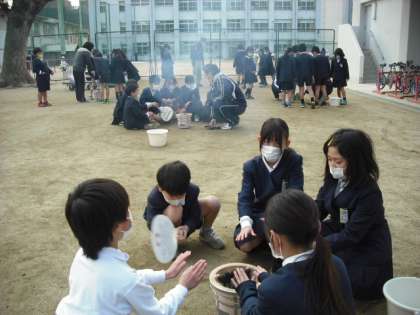 3年生が運動場のクスノキの下で、七輪体験をしました。