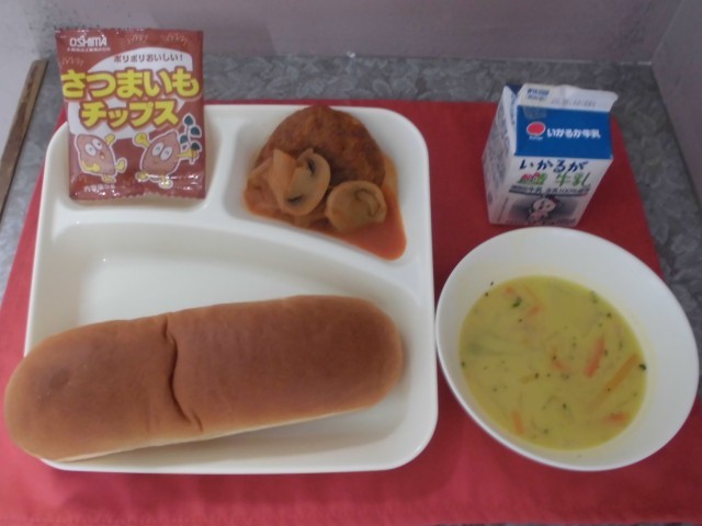 調理員さんがことことおいしく煮込んでくださったハンバーグと、野菜たっぷり具だくさんのコーンスープに、おさつチップスがついています。