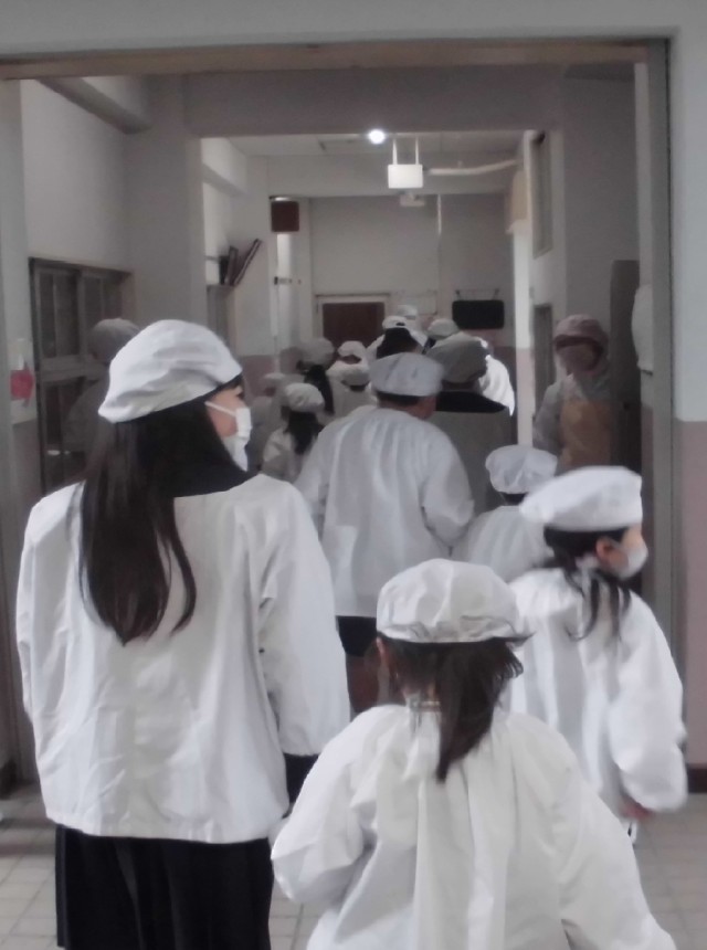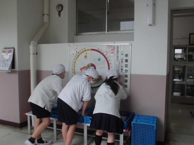 給食時には、1年生の運搬・配膳のお手伝いをしています。いつもやさしく声をかけて1年生に寄り添う姿が、ほほえましく頼もしいです。