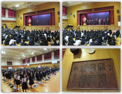 皆で、校歌を歌いました。元気いっぱい、はつらつとした歌声が、講堂に響きました。