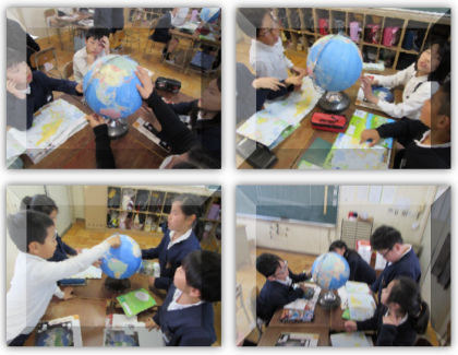 5年生の社会科の学習です。地球儀を使って、世界地図との違いを考えたり(グリーンランドとオーストラリアの大きさを比べました)、国の名前を出して、地球儀で探したりしました。