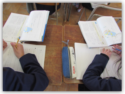 5年生の国語の学習です。「だいじょうぶ だいじょうぶ」と言ったときの、おじいちゃんの気持ち、「ぼく」の気持ちを考え、どのように音読をしたいか考えました。