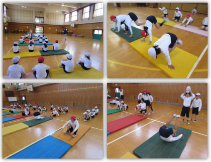 5年生の体育の学習です。今日はマット運動に取り組みました。