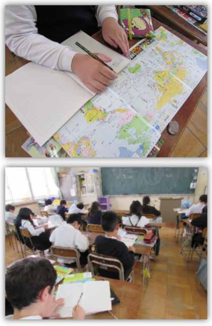 5年生の社会科の学習です。世界には主に6つの大陸と3つの海洋があり、さまざまな国があることや、地球上の位置は緯度や経度で表されることを学習しました。