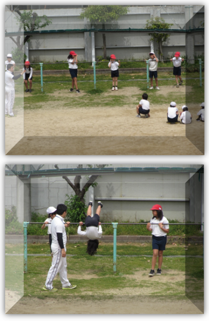 4月17日(水) 3年生の体育の学習です。鉄棒で、逆上がりに取り組んでいます。