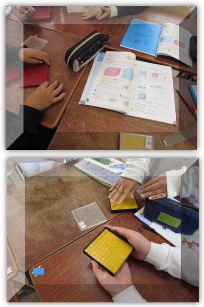 5年生の算数の学習です。1辺が1cmの立方体の積み木の数で、直方体と立方体の大きさを調べ、大きさを比較しました。