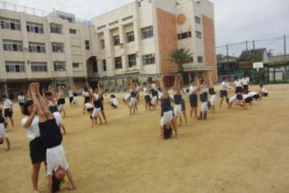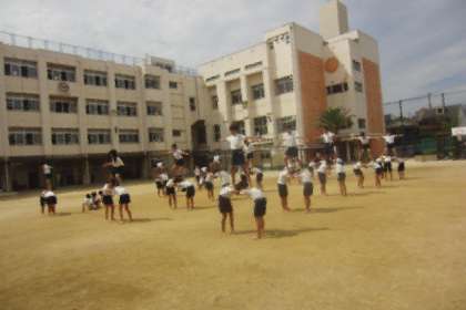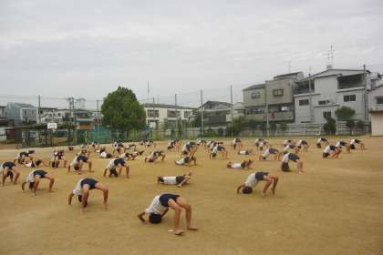 運動会の練習も2週目になり、運動場での練習も始まりました。6年生も、今日の2時間目、初めて運動場で組み立て体操の練習を行いました。背中が土だらけになっても気にせず、真剣に頑張っています。