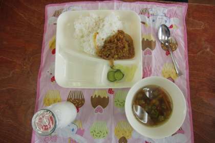 今日の給食の献立をご紹介します。今日はタコスライス、もずくと白ねぎのスープ、グリーンサラダ、ご飯、牛乳でした。今日の献立のテーマは、「暑い夏に沖縄料理&カレー味で食欲アップ」です。沖縄で有名なタコスライスの具をカレー風味にしてあります。カレー風味で食欲が増すように工夫されています。この他に、沖縄でよく食べられているもずくを使ったスープやグリーンサラダを組み合わせています。