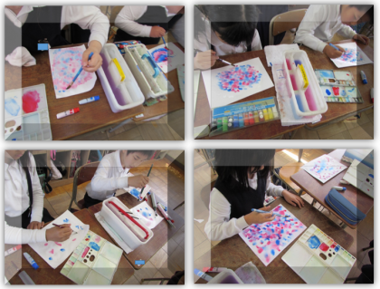 5年生の図画工作の学習です。画用紙にたっぷりの水を含ませ、そこに絵の具を落としていきました。にじみが、面白い感じを出しています。