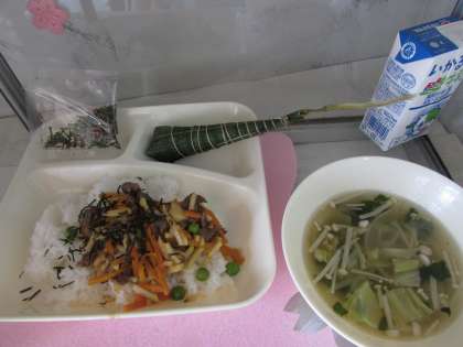 本日の給食の献立をご紹介します。本日の献立は、こどもの日の行事献立で、牛肉のちらし寿司、牛乳、すまし汁、ちまきでした。