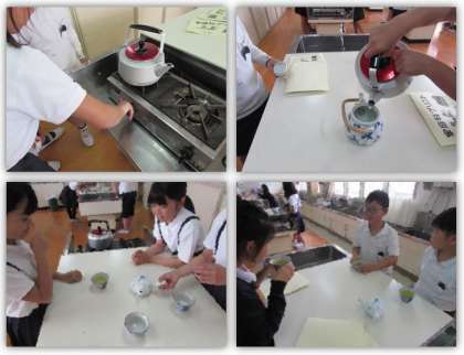 5年生の家庭科の学習です。ガスコンロの使い方を学習し、今日は実際に煎茶を入れて、飲みました。