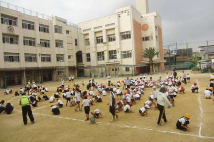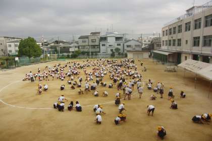 天候にも恵まれ、運動会の練習も進んでいます。6年生は、裸足になって、組み立て体操の練習に励んでいます。
