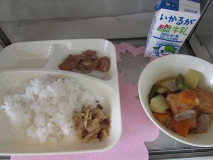 本日の給食の献立をご紹介します。本日の献立は、ご飯、牛乳、鶏肉の照り焼き、じゃがいもと厚揚げの煮物、ごまかか炒めでした。