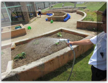 5年生は、学習園でなにわの伝統野菜「勝間南瓜」を栽培しています。毎日、当番の子が水やりをしています。