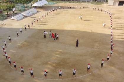 応援団の練習の様子です。今日から、運動場に出て練習を行っています。広い運動場で届くように、大きな声で頑張っています。
