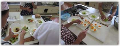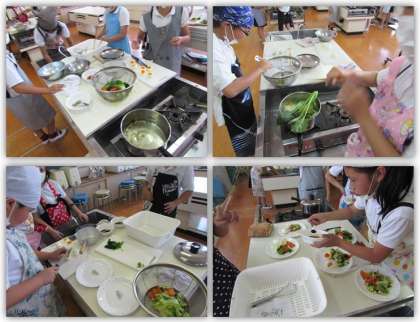 5年生の家庭科の学習です。今日は2組と3組が、ゆで玉子とゆで野菜を使った「カラフル野菜サラダ」を作りました。班で協力し、安全に、そして手際よく作ることができました。