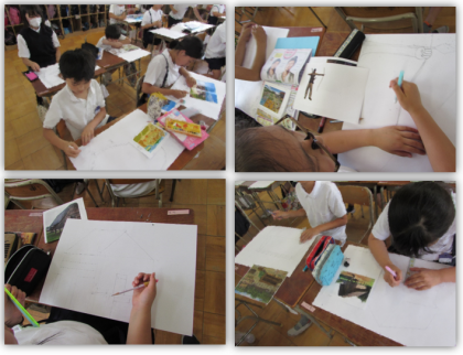6年生の図画工作の学習です。弥生文化博物館で学んだことを思い出し、弥生時代の人々のくらしの様子を想像して描きました。