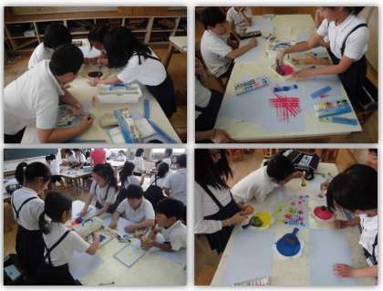 4年位の図画工作の学習です、今日は図工室に行き、ローラーやスタンプを使って、作品の台紙を作りました。