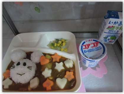 本日の給食の献立をご紹介します。本日の献立は、牛肉と大豆のカレーライス、牛乳、レタスとコーンのサラダ、ヨーグルトでした。