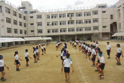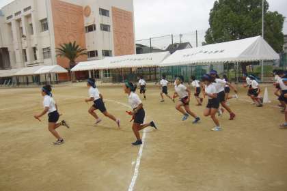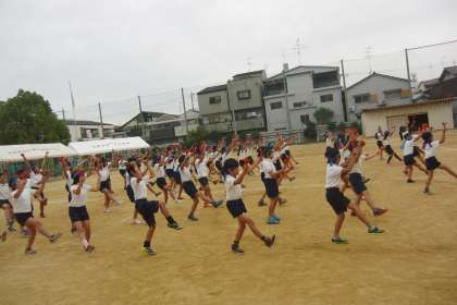 4年生が、運動場で練習をしています。4年生のダンスは「ROCK☆ハイヤ」です。今日は鉢巻をつけ、鳴子を両手に持って、踊りました。全員の鳴子の音がそろうと、たいへん迫力があります。どうぞ、お楽しみに。