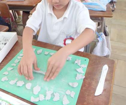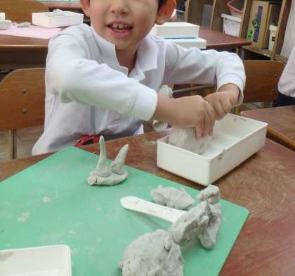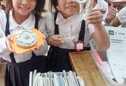 1年生の図画工作の学習です。粘土を使って、楽しく、好きなものを作っていきました。恐竜だったり、お花だったり、お店屋さんを開いたり。楽しい1時間となりました。