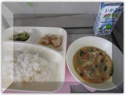本日の献立は、ご飯、牛乳、鶏肉のおろしじょうゆかけ、みそ汁、野菜炒めでした。