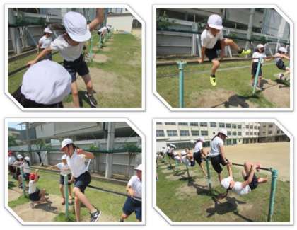 5年生の体育の学習です。今日は鉄棒で、逆上がり、ひざかけふり上がり、転向前下りに取り組みました。