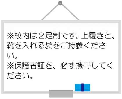 ※本校は2足制です。各教室や講堂に入る際には、必ず上履きをご持参ください。また、ご自身の靴は袋に入れてお持ちください。